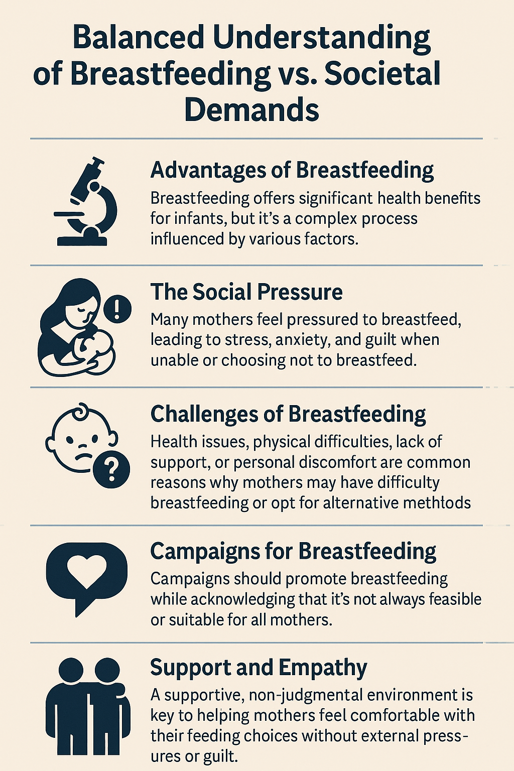 המסר המועבר בקמפיינים צריך להיות מאוזן ומתחשב, תוך הדגשת התמיכה הזמינה לאמהות מניקות אך גם תוך הכרה בכך שהנקה אינה תמיד אפשרית או מתאימה לכל אחת. חשוב להימנע מיצירת תחושה שהנקה היא מדד בלעדי לאמהות טובה.